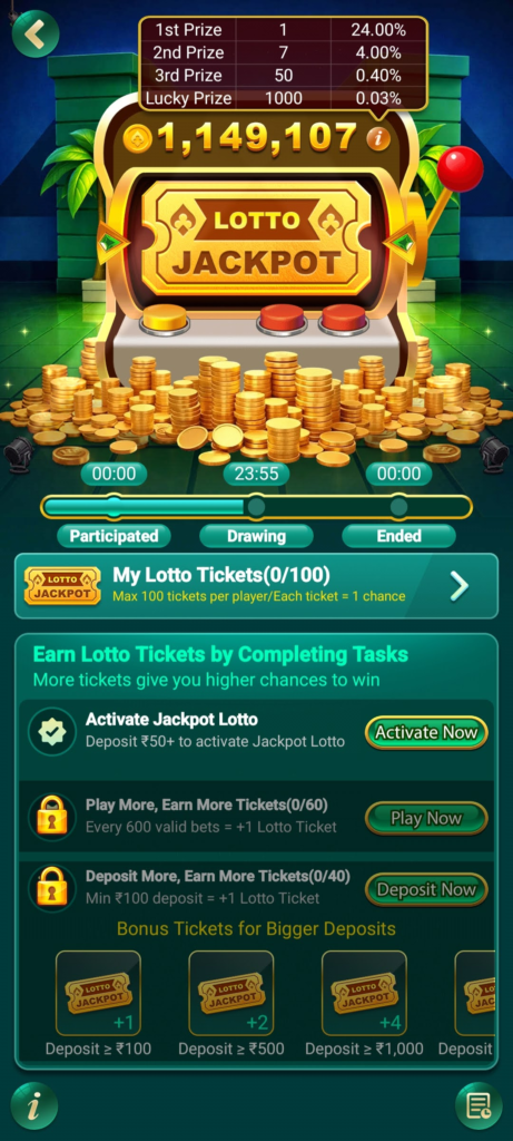जब कोई नया यूज़र ऐप में रजिस्टर करता है, तो उसे वेलकम बोनस मिल सकता है। इस बोनस का उपयोग आमतौर पर गेम खेलने के लिए किया जा सकता है।