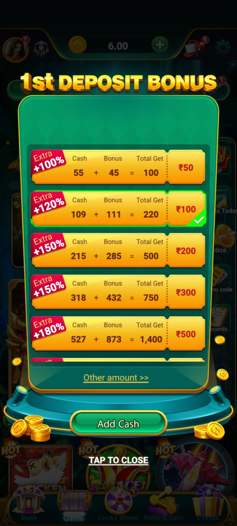 दोस्तों अगर आप इस एप्लीकेशन में गेम खेल रहे हैं और आपके गेम में का पैसा खत्म हो चुका है तो आप अलग से भी पैसा डिपॉजिट करके गेम को खेल सकते हैं उसके लिए आपको ऐड कैश पर क्लिक करना होगा और फिर आपको जितना पैसा इसमें डिपाजिट करना है उतना पैसा अपने मोबाइल से डिपाजिट कर सकते हैं दोस्तों आप इस एप्लीकेशन में कम से कम ₹50 तक डिपॉजिट कर सकते हैं डिपॉजिट करते हैं या पैसा आपके एप्लीकेशन और वॉलेट में चला जाएगा फिर आप उस पैसे का उपयोग गेम में कर सकते हैं